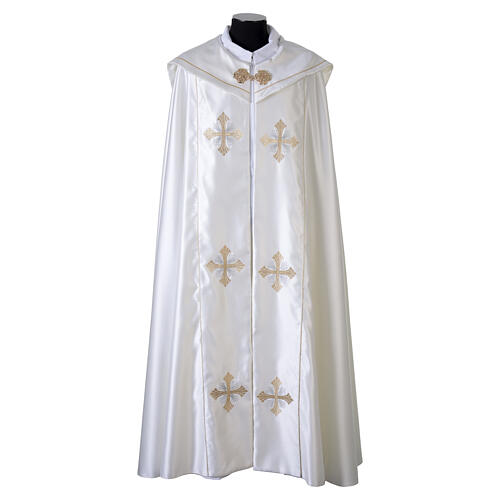 Cope made of ivory fabric with a wide cut and a fluid drape.
