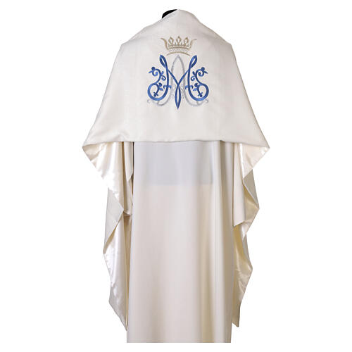 Humeral veil in ivory polyester-blend fabric with embroidered Marian monogram. Length 110 in, width 21.25 in.