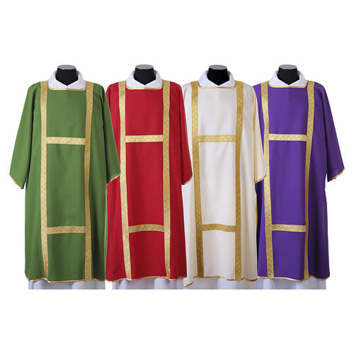 Deacon dalmatic crafted from polyester, suitable for all liturgical seasons and available in ivory, red, green, and purple.