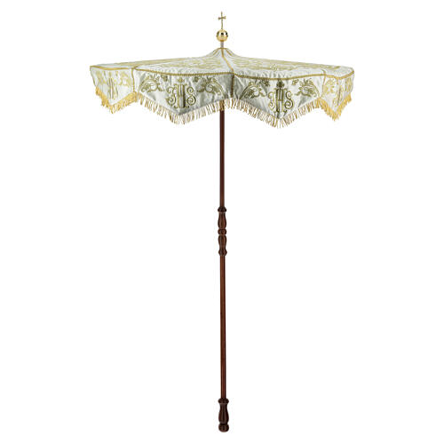 This processional umbrella has an octagonal ivory fabric cover richly decorated with machine embroidery in gold thread, radiating from the centre across the eight panels.
