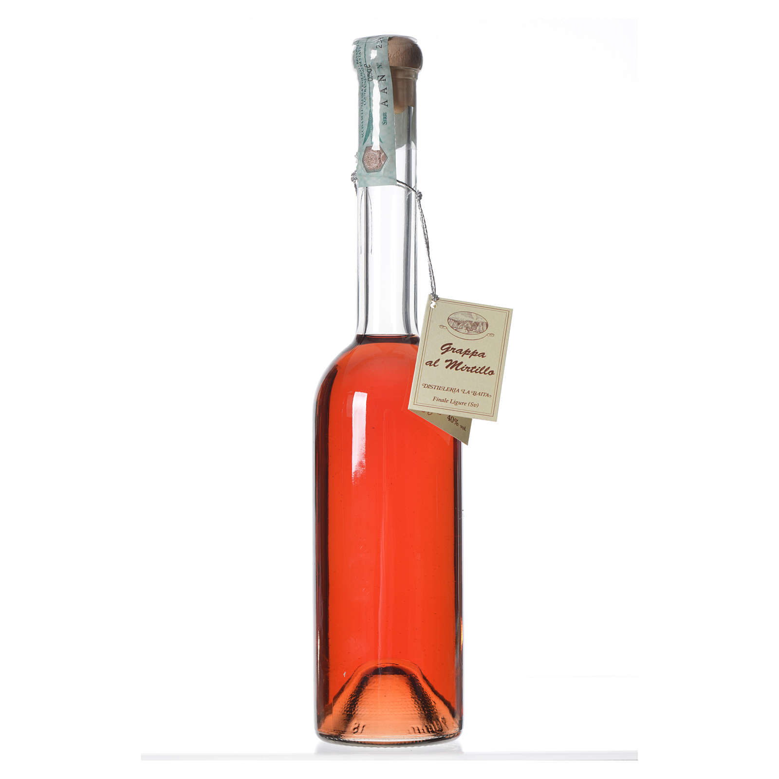 Artisanal grappa produced in the distillery La Baita dei Padri Benedettini of the abbey of Finalpia, in Liguria. Pure grape marc spirit with blueberry infusion. Ingredients: fine grappa, fruits and blueberry juice. Alcoholic grade: 40%.