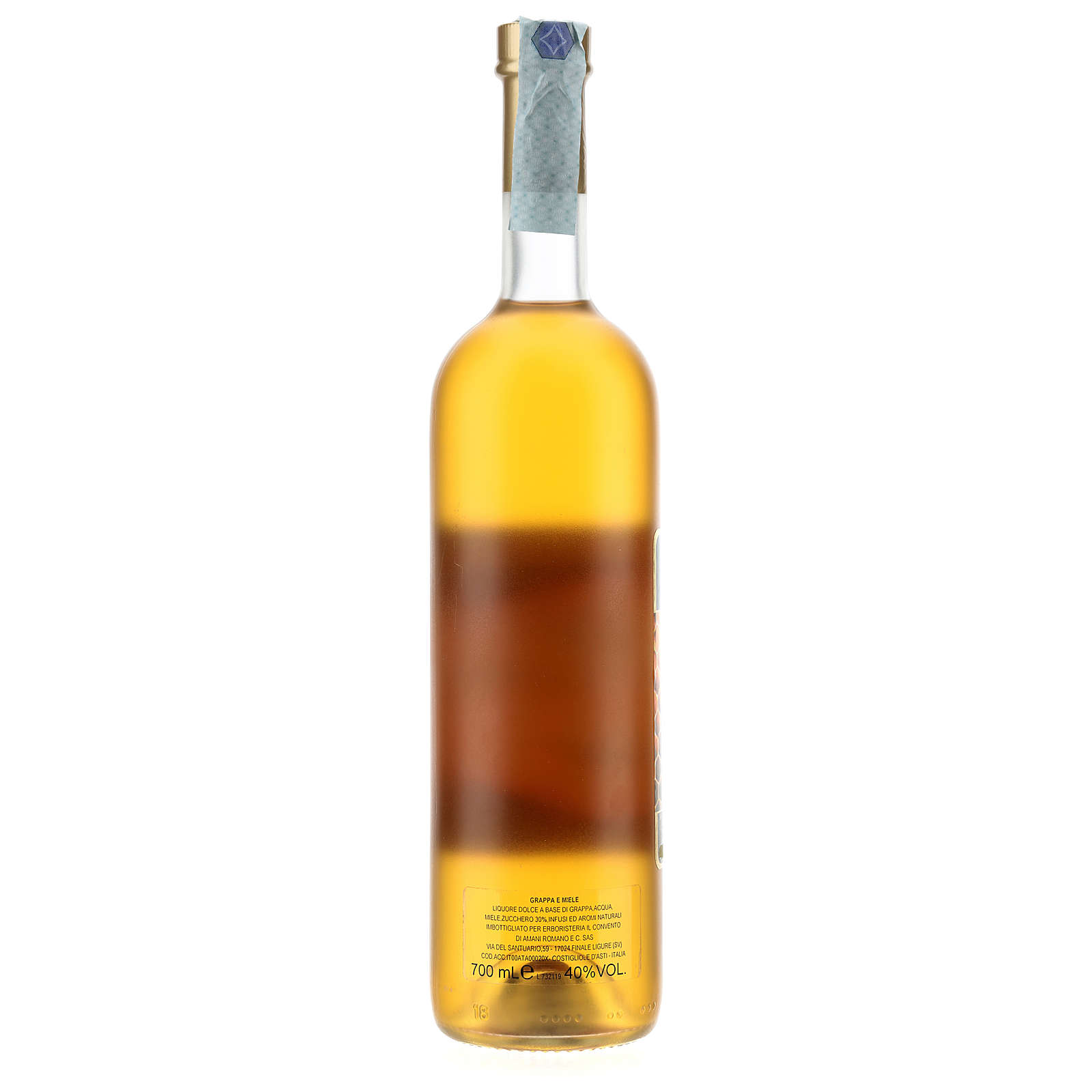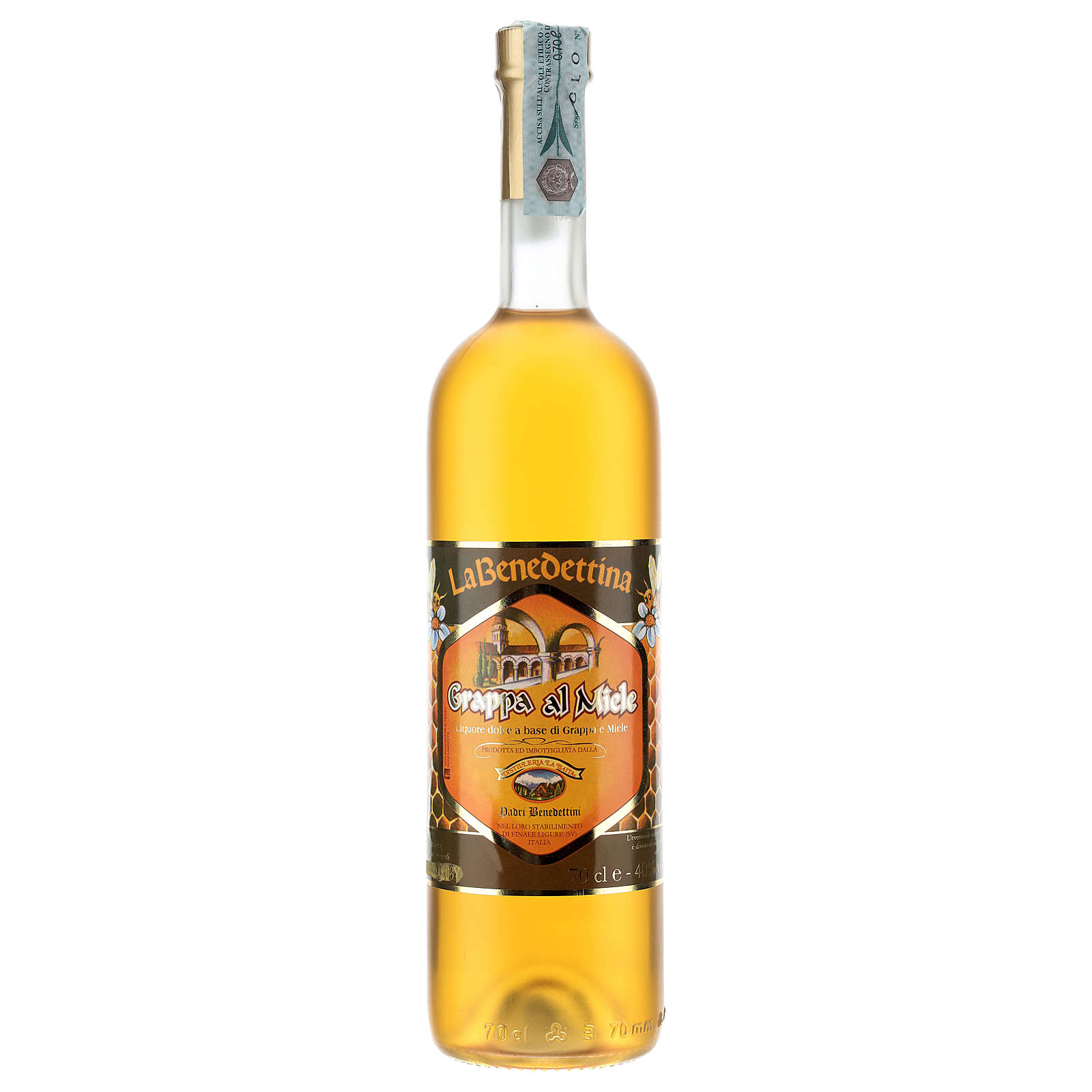 Honey grappa 700 ml. Honey flavoured grappa produced in the La Baita distillery by the Benedictine monks of the Finalpia Abbey. 40% vol. The honey grappa is available in 700ml bottle.