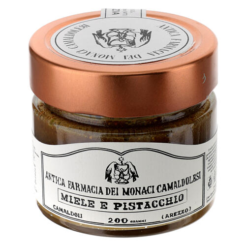 Honey and Sicilian Bronte pistachios by Camaldoli 200 g. Honey pistachio spread made with Italian acacia honey enriched with 20% of prestigious paste of Sicilian Bronte pistachio. This sweet spread is made in Italy by rigourously selected beekepers and distributed by the Antica Farmacia Camaldoli. Perfect for elevate a desert, a snack or simply your hot milk and tea.