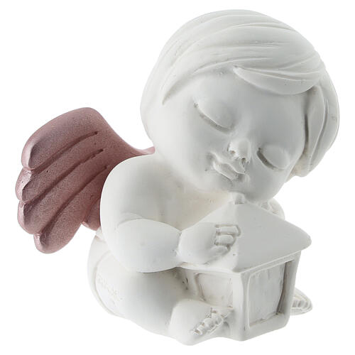 Resin statuette depicting a seated, serene angel painted white and holding a small lantern.