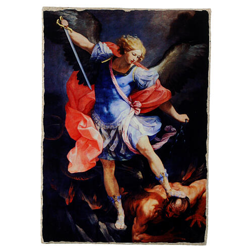 St. Michael the Archangel by Guido Reni, 5x7 in, Bottega Tifernate, retouched finish. This work of art is a reproduction of the famous painting "Saint Michael the Archangel" by Guido Reni, belonging to the Linea Aurea collection by Bottega Tifernate. Measuring 6.7 in long and 4.7 in wide, it is perfect as an exclusive gift or high-end favour. Each piece is unique, made and finished by hand by experienced painters with academic training.