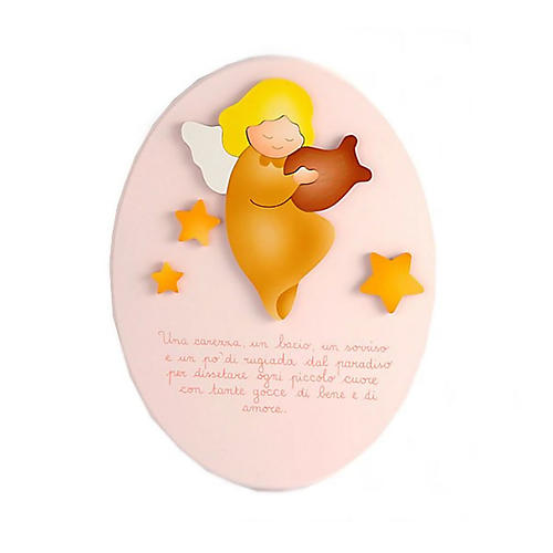 A pink oval plaque with an angel and a nursery rhyme. It is a perfect gift for children, a spiritual and intense gift. This plaque is entirely hand-made by the young artists of the Focolare movement of Loppiano. A precious work of art expressing a sense of love and peace.