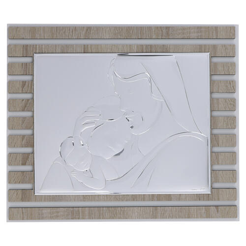 Decorative Holy Family picture in sand-finish silver bilaminate mounted on a wooden MDF structure, measuring 14.6x17.7 in.