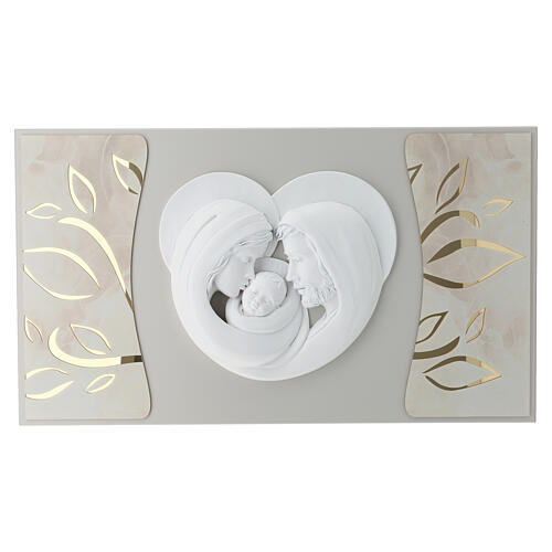 Modern Holy Family wall panel in white and gold relief, 16x28 in.