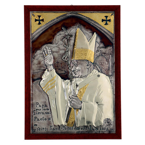 Picture of Pope John Paul II, chiseled copper, 15.7x11 inches. Picture of Pope John Paul II greeting the faithful with the crosier in his hand, made of a wood board and a copper plate, chiseled by hand, treated with gold and silver galvanic bath and finished with an antioxidant plasma treatement.