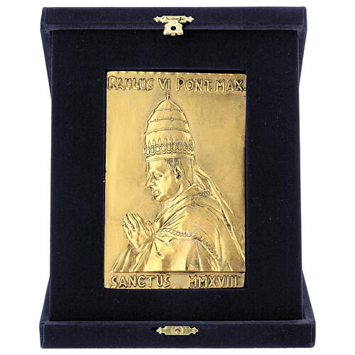 Zinc and copper alloy plaque depicting Pope Paul VI, measuring 5.1x3.15 in, presented in a blue velvet box of 8.3x6.7x1.2 in.