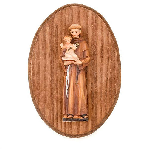 Maple wood plaque with statue of Saint Anthony of Padua, the statue is finely carved and hand-painted by expert craftsmen in Val Gardena, Italy. The plaque is equipped with a support to position it on a table or to be naged on the wall.