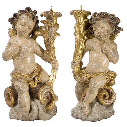 Candle holder with angels 25cm Old antique gold Valgardena wood