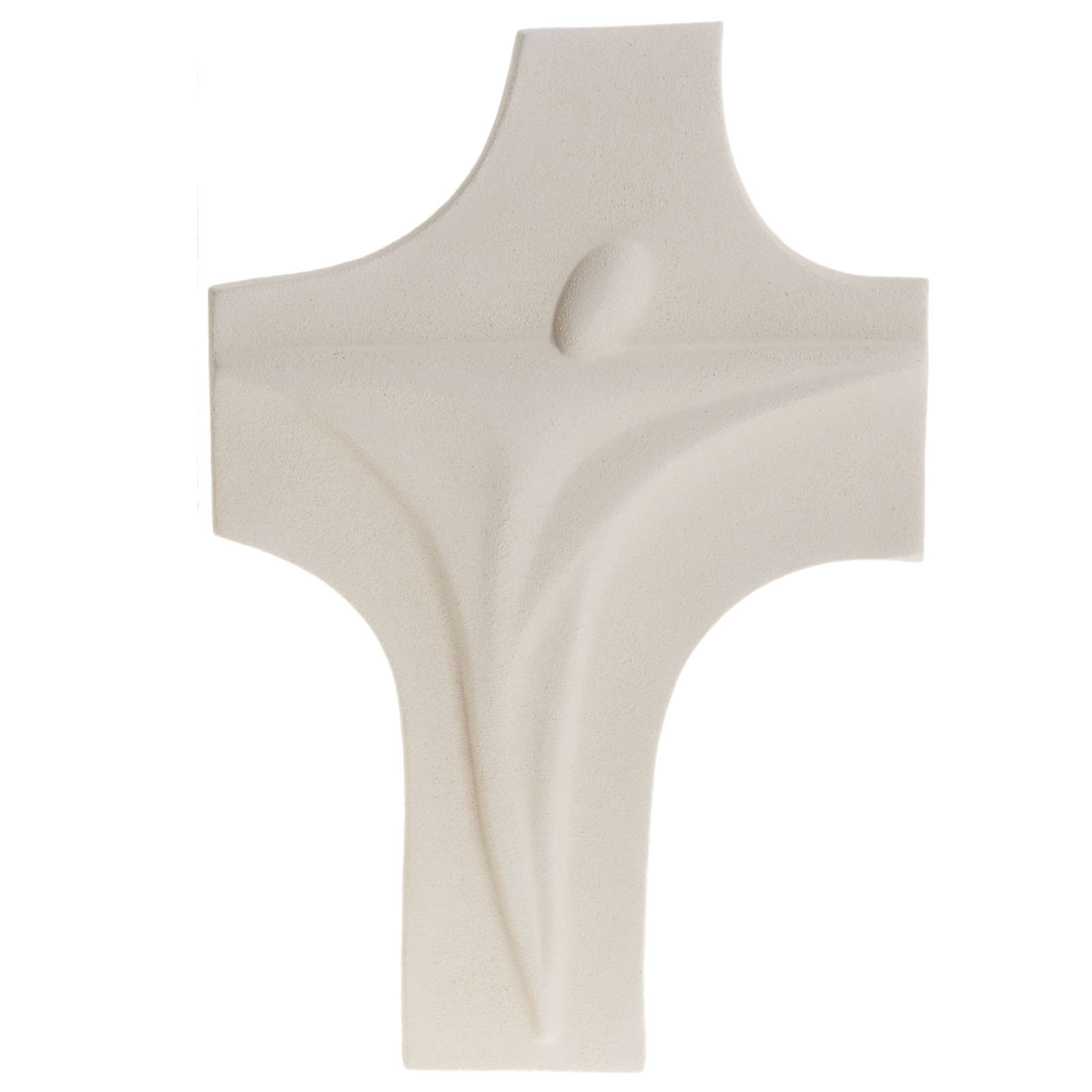 This hand-made bas-relief depicts a fireclay crucifix with risen Christ. The stylized bas-relief is firstly hand worked, then baked at more than 1000° degrees and hand finished.
