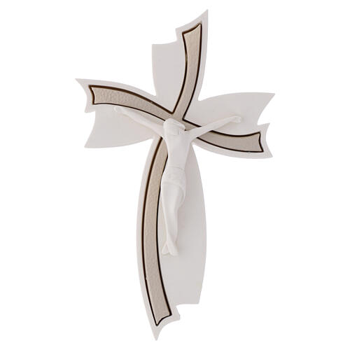 Flared wall crucifix in matte white ceramic with taupe hammered-effect insets, 6x4 in