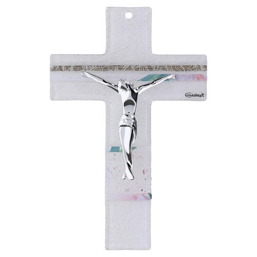 The crucifix has a classic squared-armed shape with a matte surface and subtle translucency in the central area. Fragments of coloured glass in shades of pink with touches of blue are placed at the top and bot...