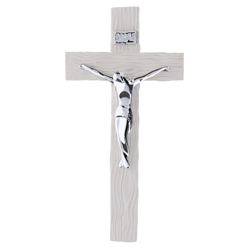 Resin cross with white wood-effect finish and polished silver body, 6x3 in