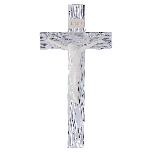The cross features a textured finish that reproduces wood grain with metallic silver highlights; the stylised body of Christ is sculpted in white matte resin and applied in relief.