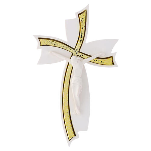 Wall crucifix "Fiocco", white with gold accents, white resin body, 6x3 in