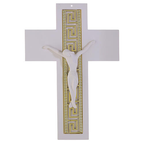 Made of resin, this white cross features a golden Greek decoration and a modern white finish, measuring 12.6x8.7 in.