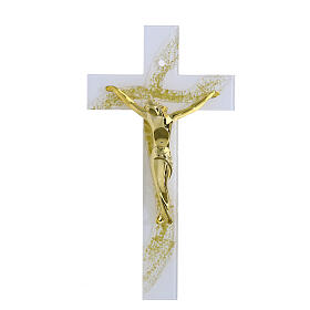 Wave cross in white glass with gold glitter and stylised gold body, 6x3 in