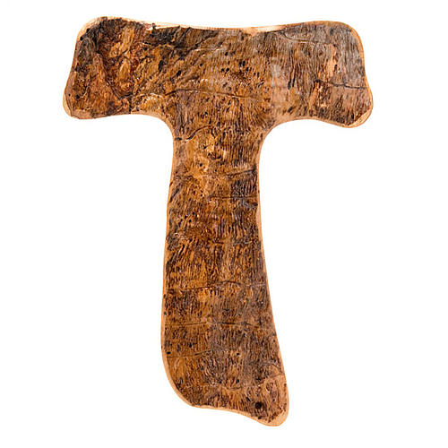 Tau cross in olive wood and bark entirely hand-made by expert craftsmen im Assisi. Olive wood undergoes an aging process toegether with its bark for 5-6 years, during this period of time the woodworm lives between the wood and the bark layer without penetrating thus creating patters and small holes on the wood surface. It is a natural process that is exclusively typical of some special wood and during some specific periods. What sometimes is considered a defect can become an added value. FOR A C...