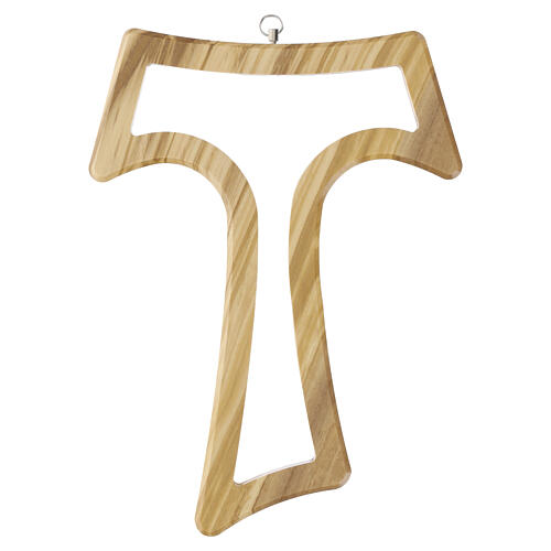 Tau cross in olive wood with carved openwork and central opening, 10 in
