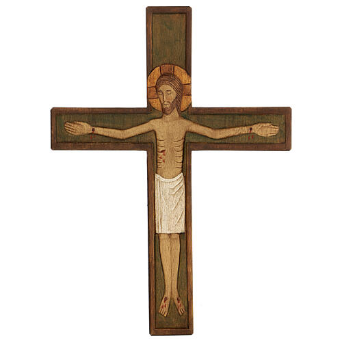 Hand-made, painted crucifix manufactured by the artisan nuns of the Monastery of Bethleem in France. The edges of the cross and the crucifix are in relief, the halo is painted in gold. Precious and exclusive crucifix.
