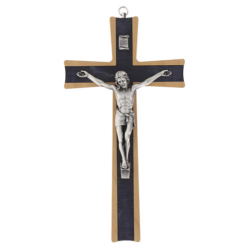 Crucifix in beech with dark insert and silver‑plated metal body, 10 in