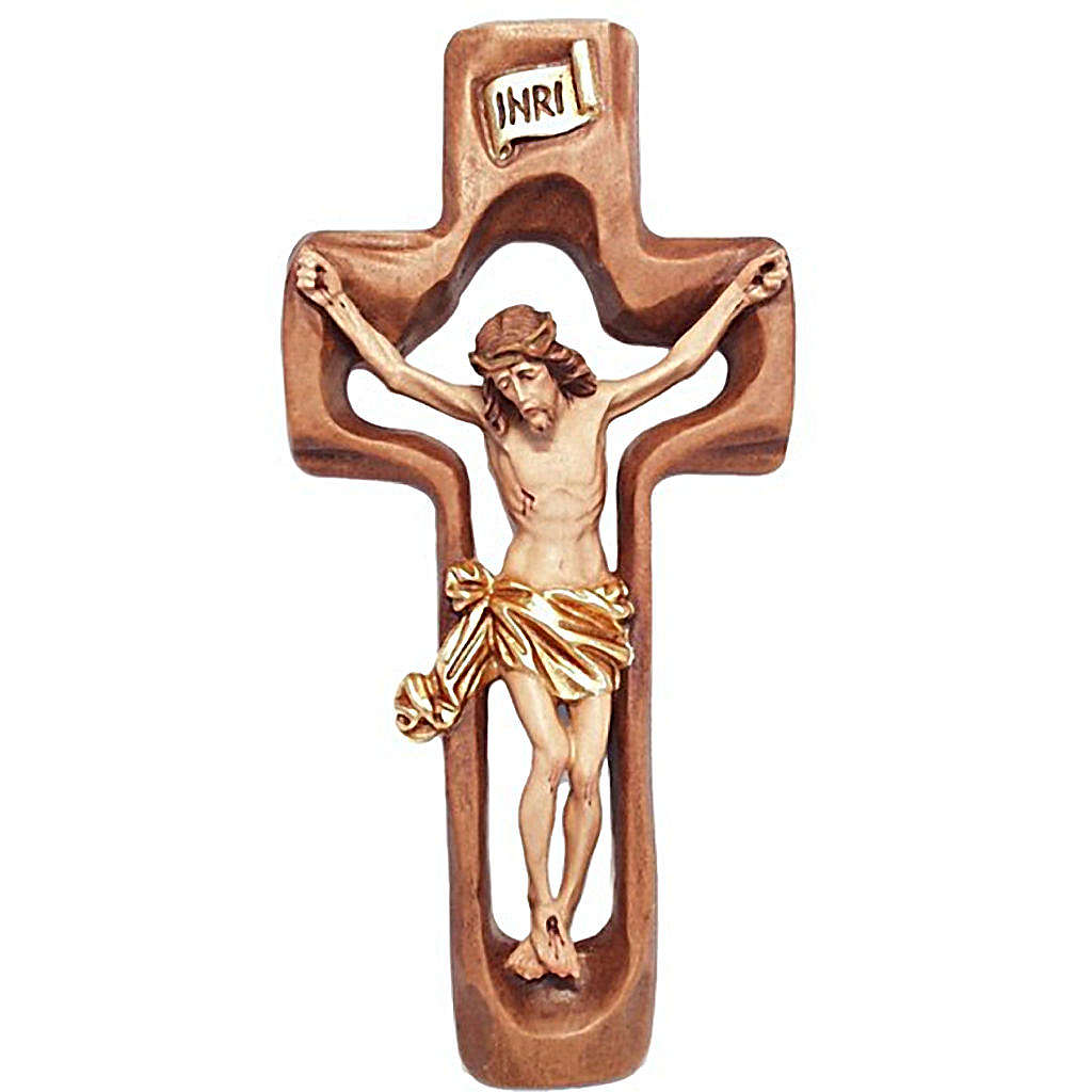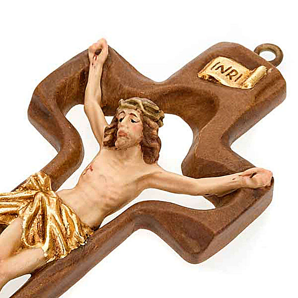 Crucifix on stylised cross. Maplewood cross with painted wood crucifix. The cross is stylised while the Christ's body is a more traditional representation.