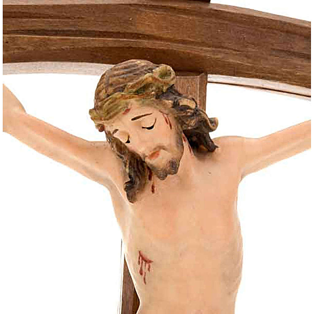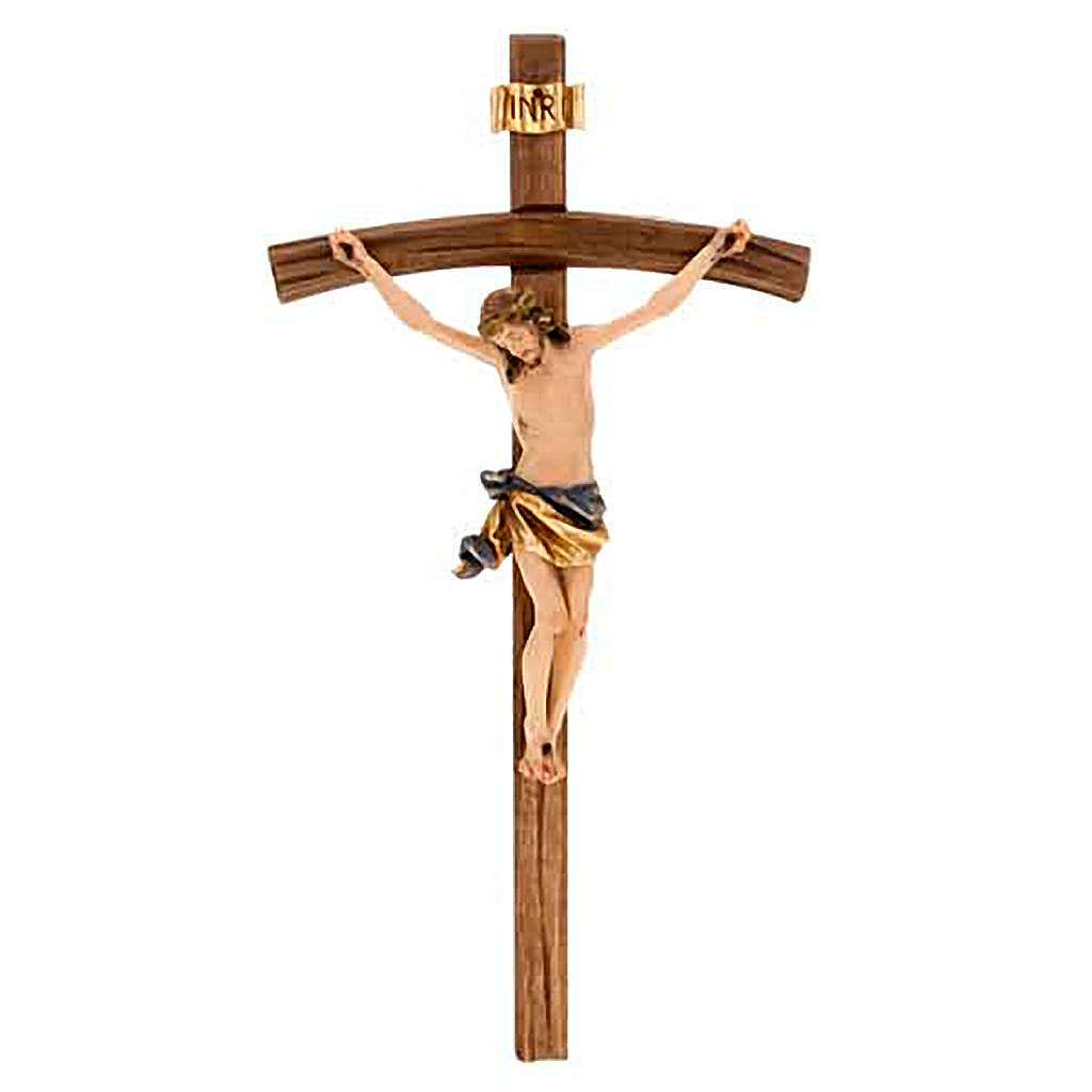 Curved cross in dark maplewood with hand-painted Christ's body. The INRI writing on the cross is on golden, red parchment.