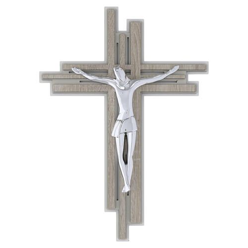 Wall crucifix with a stylised Christ in silver-plated metal on a pierced elm wood cross.