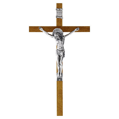 Wall crucifix in pale wood with a smooth, uniform surface, fitted with an upper metal hanger and a figure of Christ cast in alloy with a silver finish, complete with nimbus. Its simple vertical linear design is suitable for religious spaces, home chapels or sacred furnishings.