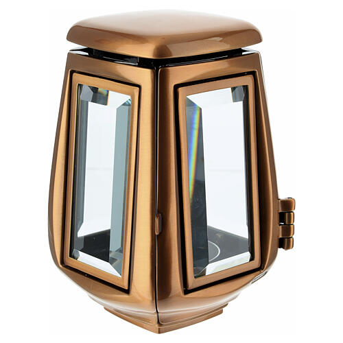 Ground candle holder lamp in brass with shiny bronze finish and glass with baguette cut. This sturdy and durable candle holder is perfect for outdoor placement to protect cemetery candles from the elements.