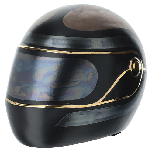 Black motorcycle helmet urn with gold details, 10x9x12 in, 8 litres. A refined ceramic cremation urn inspired by the shape of a motorcycle helmet and embellished with delicate golden lines that harmoniously follow its contours. Crafted with enamels and ceramic colours, the urn is double-fired at 900°C, featuring 10% gold or platinum lustres, and then subjected to a third firing at 780°C to achieve a precious and luminous effect. Dimensions: height 9.8 in, length 9.1 in, depth 11.8 in.