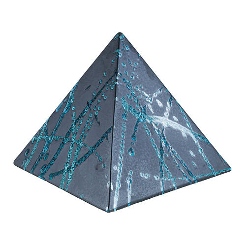 Ceramic cinerary urn with a geometric and refined design, inspired by the solemnity and symbolism of the pyramid, an emblem of stability and eternal memory. The surface, in an elegant matte black finish, is enriched with light blue brushstrokes embellished with glitter, creating a captivating play of lights and shadows that adds depth and movement to the composition. This particular chromatic effect gives the urn a sophisticated and timeless appearance.