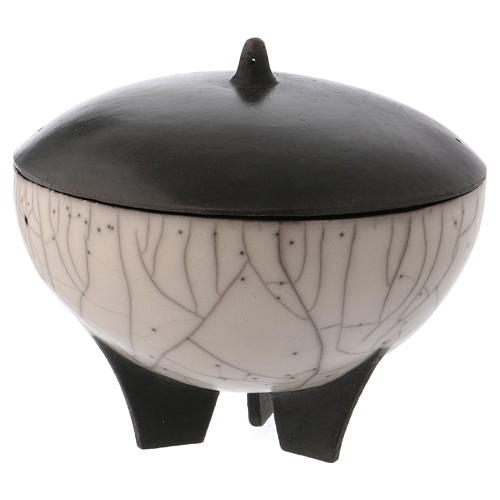 This cremation urn is entirely hand made and baked following the Japanese tradition called Raku and embellished with a variation of the technique Kintsugi, using some resins with biocomponents.