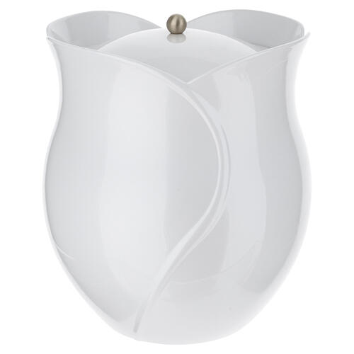 Cinerary urn for the preservation of ashes, made of ceramic material with a pearl white finish and an internal capacity of 4 litres.