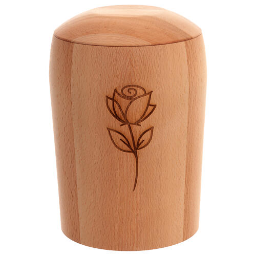 Eco-friendly beech wood cremation urn with rose engraving.