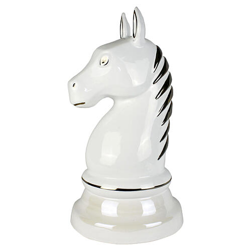 The shape recalls the chess knight, featuring a glossy white surface and reflective platinum details on the mane, eyes and base.