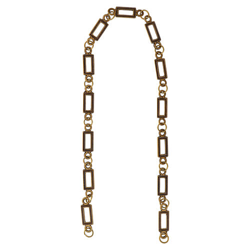 Bronze-finish chain with burnished decorative accents, composed of rectangular links and round connecting rings. Ideal for elegantly closing off spaces outdoors or as an accessory for suspension lamps, sanctuary lamps and other sacred furnishings.