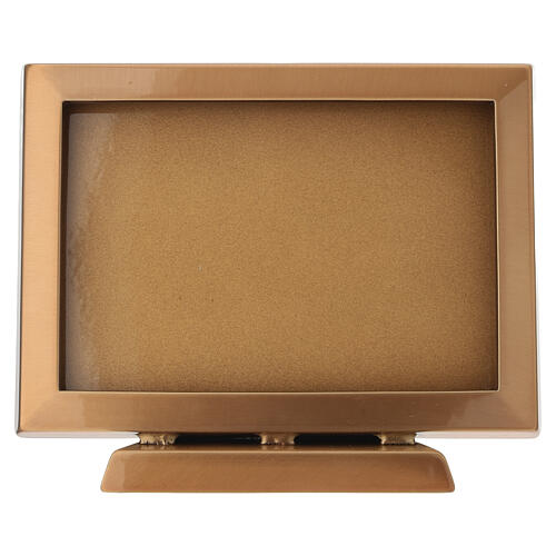 Rectangular frame for photographic ceramics or laminated images measuring 3.9x5.9 in, supplied with a triangular base. The bronzed, sober and elegant frame does not include glass and is designed for images suitable for outdoor use.