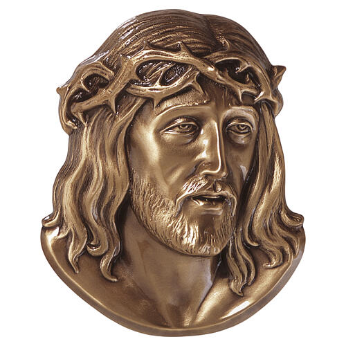 High-quality bronzed outdoor plaque depicting the face of Jesus Christ, suffering and crowned with thorns. Suitable for outdoor display due to a special protective patina. Ideal for decorating niches, walls, and tombstones, the sculpture comes with fixing pins to secure in pre-drilled holes at the back.