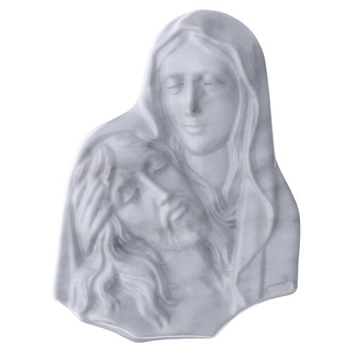 Pietà wall plaque with Our Lady and Jesus Christ, Carrara marble finish, for outdoor use.