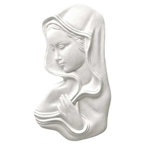 Made of white enameled bronzed alloy, depicting the face of the Virgin Mary looking to the left (her right). Mary has a serene face with closed eyes, and a hand on her chest.