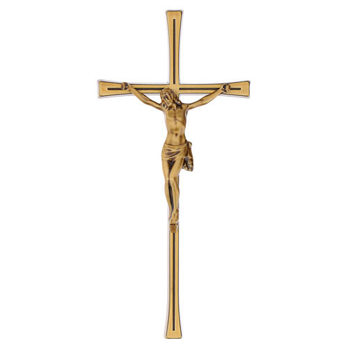 Wall-mounted bronzed crucifix with a channelled Latin cross and an applied classical-style corpus of Christ. Suitable for outdoor display, ideal for decorating plaques, gravestones and monuments.