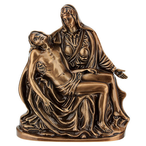 Bronzed statue depicting Michelangelo's Pietà on a smooth base.