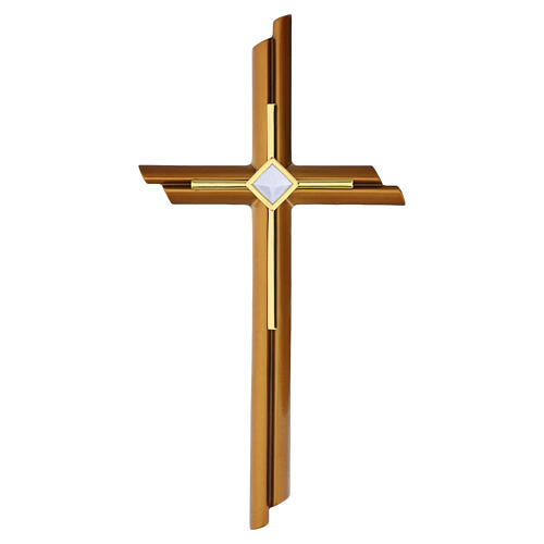 The cross features a contemporary bronzed body with a golden central application.