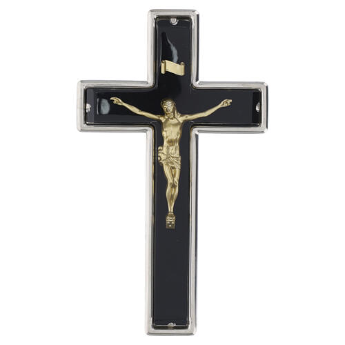 The design features a dark-background cross with a linear profile and a Christ figure in chromatic contrast, a classical arrangement with even surfaces suitable for funerary and lapidary contexts.