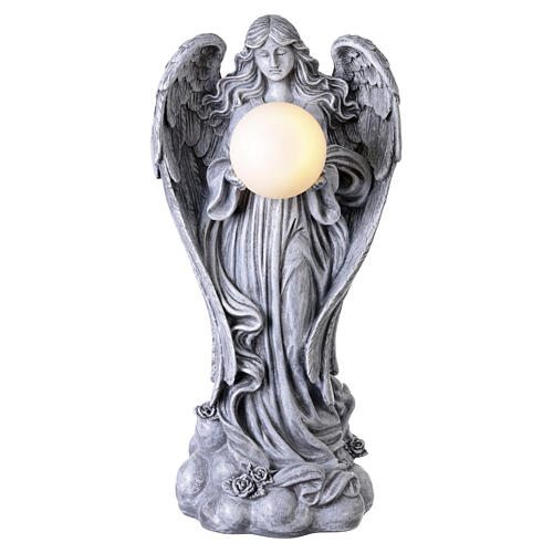 Outdoor angel statue in dark-coloured resin with a standing angel and a front-illuminated globe.