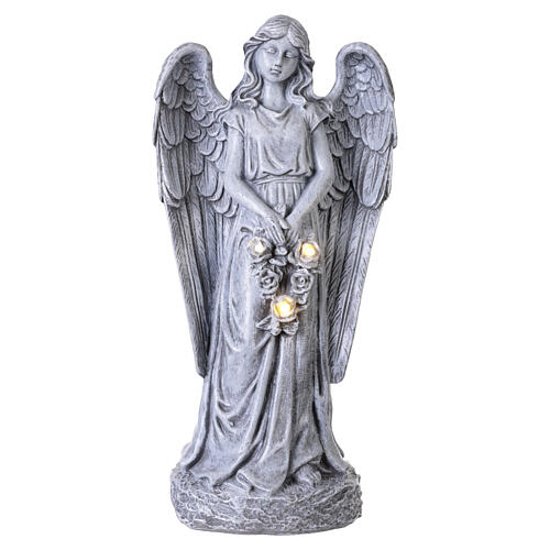 Outdoor angel with rose bouquet and solar light, 20 in, stone-effect finish.